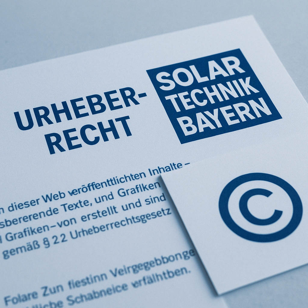 Alle auf dieser Webseite veröffentlichten Inhalte – insbesondere Texte, Bilder, Grafiken und sonstige Darstellungen – wurden von Solartechnik Bayern erstellt und sind ebenso urheberrechtlich geschützt gemäß § 2 Urheberrechtsgesetz (UrhG). Die Nutzung, Vervielfältigung, Verbreitung oder Veröffentlichung der Inhalte – auch auszugsweise – ist ohne ausdrückliche schriftliche Zustimmung von Solartechnik Bayern nicht gestattet. Eine Ausnahme bilden von uns bereitgestellte Downloads (z. B. PDF-Dokumente): Diese dürfen im Ganzen und unverändert weitergegeben und verbreitet werden. Wir bitten um Verständnis, dass wir uns bei Missbrauch oder Zuwiderhandlungen rechtliche Schritte vorbehalten und gegebenenfalls Schadenersatz geltend machen.